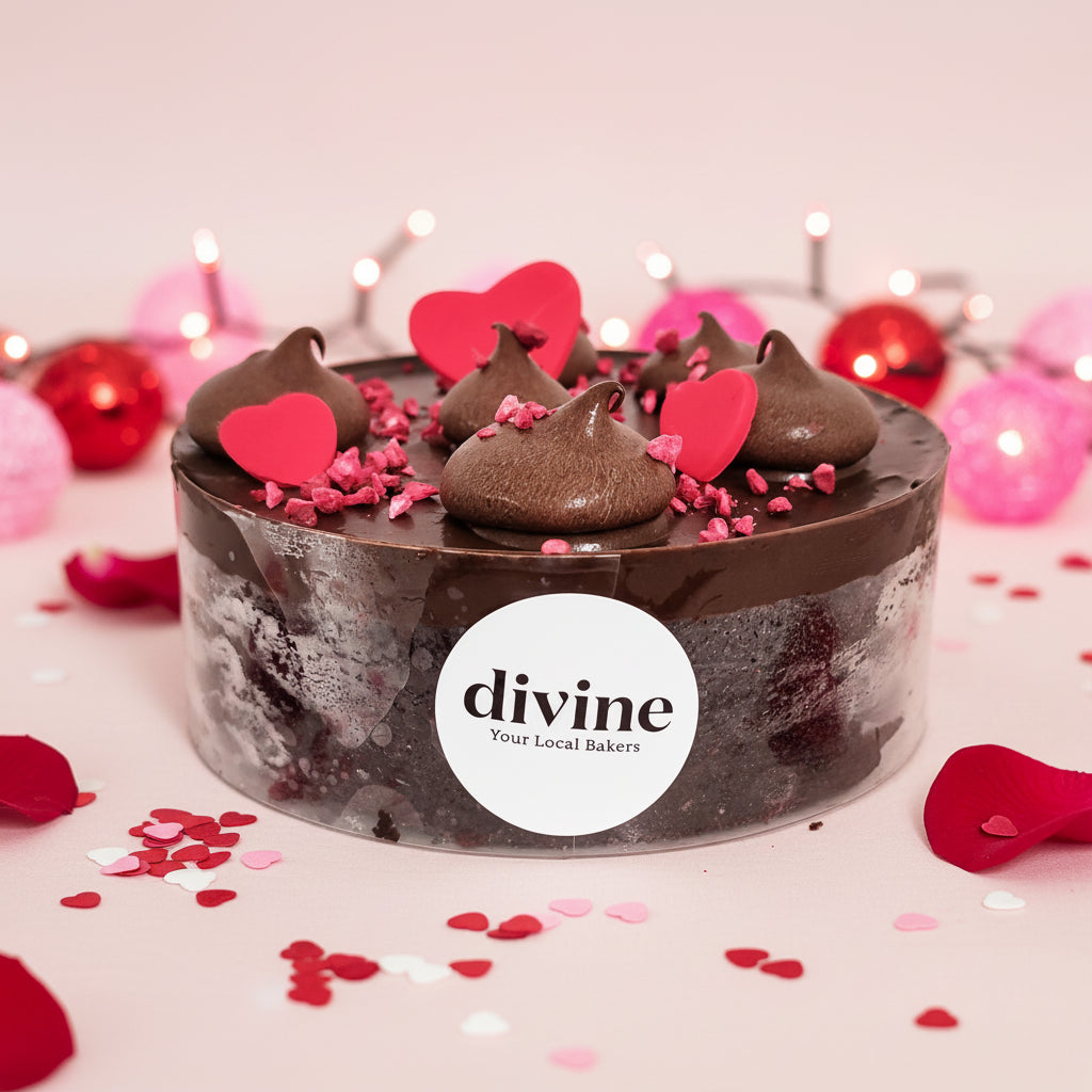 Indulge in a rich, velvety chocolate sponge topped with a layer of silky dark dairy-free chocolate icing and finished with charming red fondant hearts. It’s the ultimate treat for that special someone (or yourself)